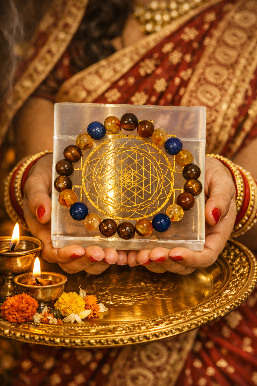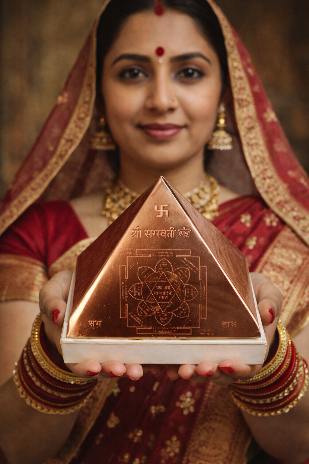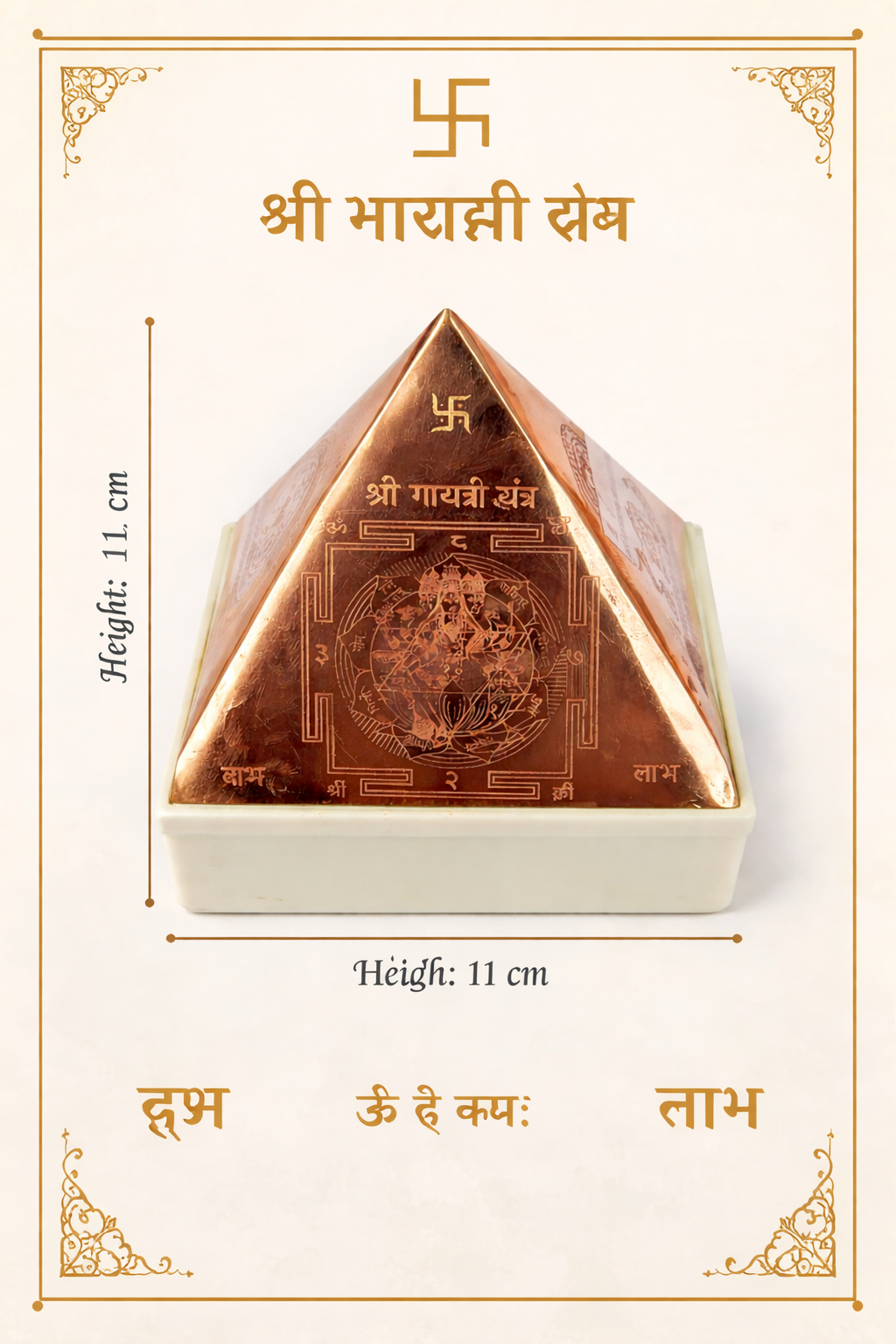 Inside the pyramid are carefully chosen Gem Stones, Rudraksha, Kawadi, and Gomati Chakra — traditionally believed to create a balanced and positive atmosphere. With its compact 11 cm × 11 cm size, it fits perfectly on your study table as your silent study partner.